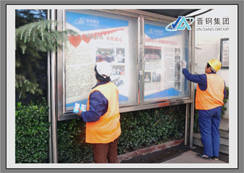 宣傳欄是公司企業(yè)形象的窗口和企業(yè)文化宣傳的前沿陣地,也是員工信息溝通、信息傳遞和汲取文化營(yíng)養(yǎng)的重要陣地之一。圖為環(huán)衛(wèi)工在清潔宣傳欄。