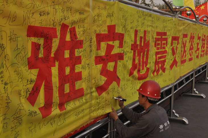 寫下對地震災(zāi)區(qū)的祝愿,帶去對雅安人民的祝福,職工們捐款后,默默地在簽名條幅上寫下“雅安,加油”“雅安,我們在一起”“情系雅安”等祝福的話語,留下自己的名字,為雅安人民祈福。