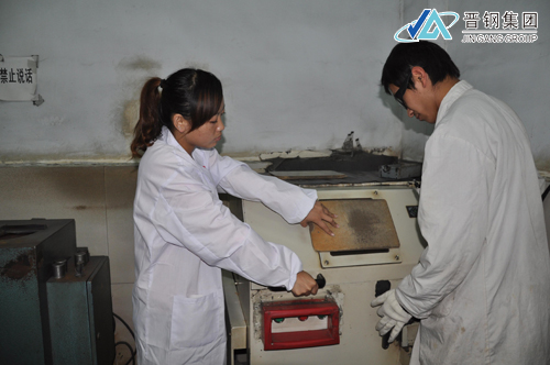 除做連鑄、轉(zhuǎn)爐、片樣檢測(cè)外,吳莎莎還會(huì)根據(jù)工作需要切割樣。切割樣通常由男化驗(yàn)員完成,同時(shí)班長要在現(xiàn)場(chǎng)監(jiān)督安全。圖為吳莎莎與男化驗(yàn)員在切割樣。